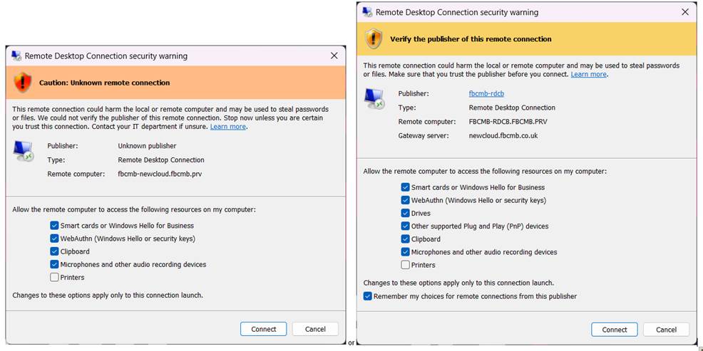 What this will mean for you is that until the process is completed you will have 2 new warning messages that must be accepted before you can connect to Hosted.