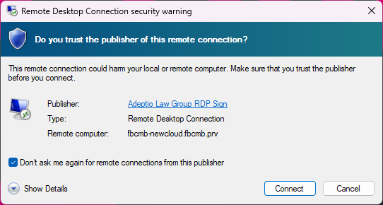 This shows that the publisher is Adeptio Law Group and that the connection is signed, check the box "Don't ask me again" and click connect.